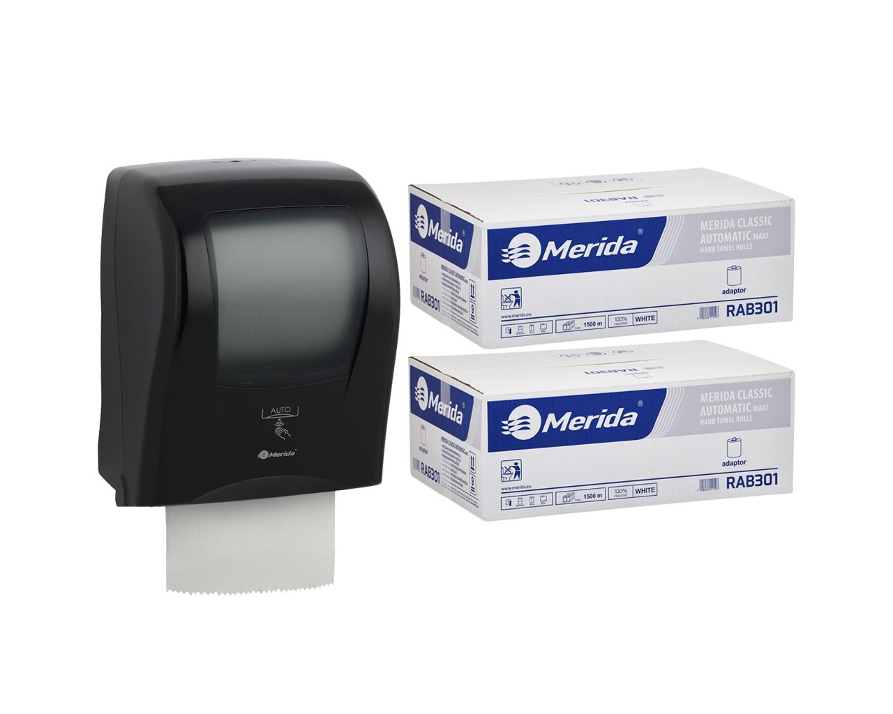 Automatyczny bezdotykowy podajnik ręczników MERIDA ONE czarny za 250 zł netto przy zakupie 2 kartonów ręczników MERIDA CLASSIC AUTOMATIC RAB301 (12 x 250 m = 3 000 m11 760 listków)