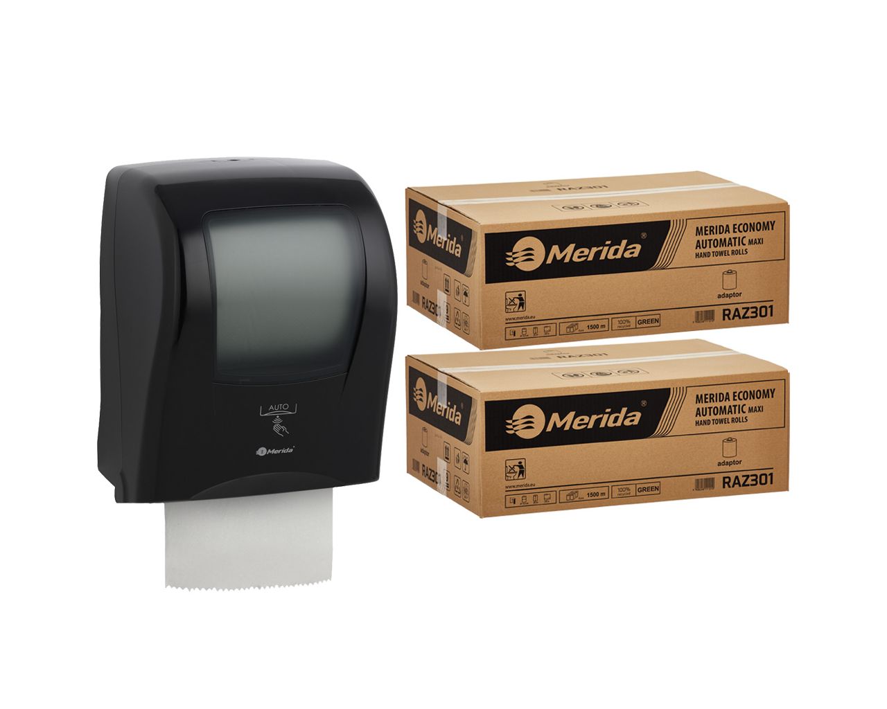 Automatyczny bezdotykowy podajnik ręczników MERIDA ONE czarny za 250 zł netto przy zakupie 2 kartonów ręczników MERIDA ECONOMY AUTOMATIC RAZ301