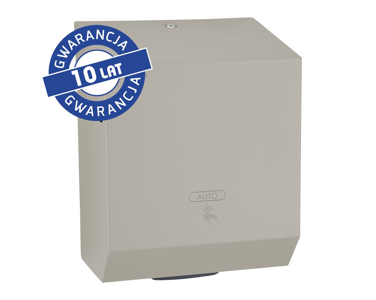 Wykonany ze stali nierdzewnej. Obudowa pokryta specjalną strukturalną kamienno szarą powłoką. Podajnik ręczników zabezpieczony jest trwałym stalowym zamkiem bębenkowym. Zamek zlicowany z powierzchnią urządzenia. Łączenia boków podajnika ręczników są spawane i szlifowane. Urządzenie posiada niewidoczne zawiasy. Zamykany na kluczyk.
