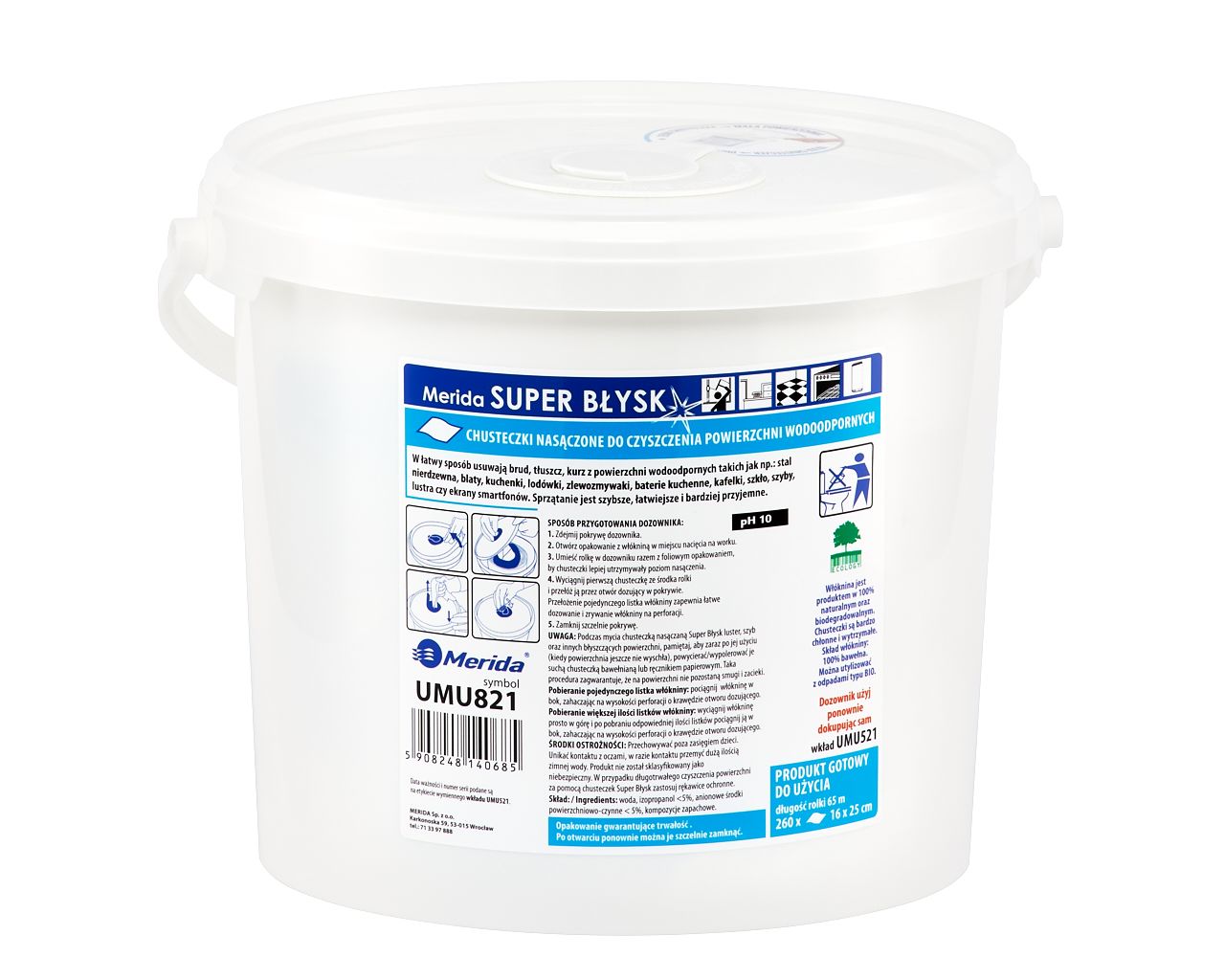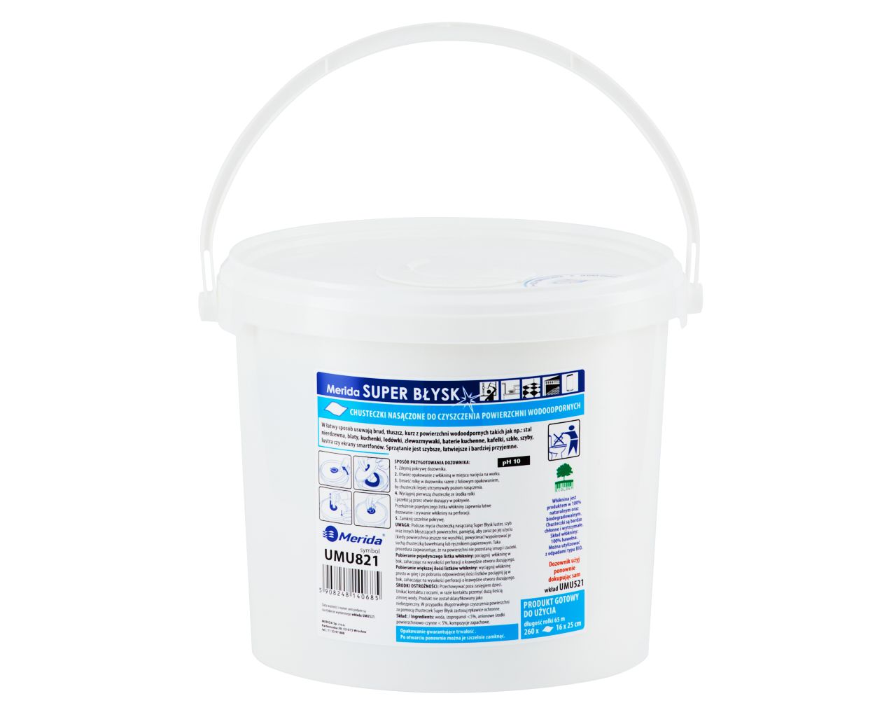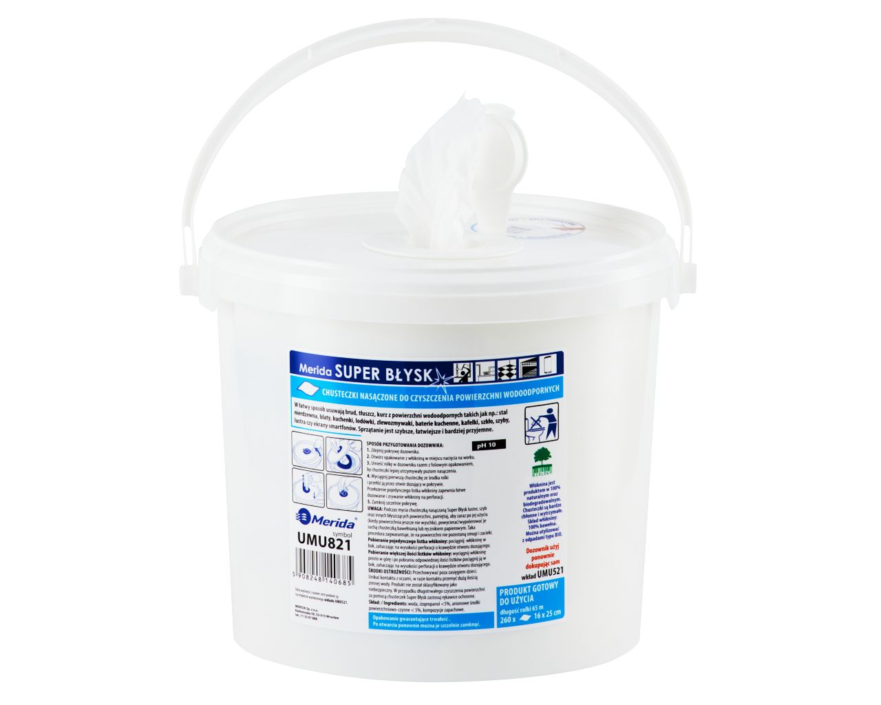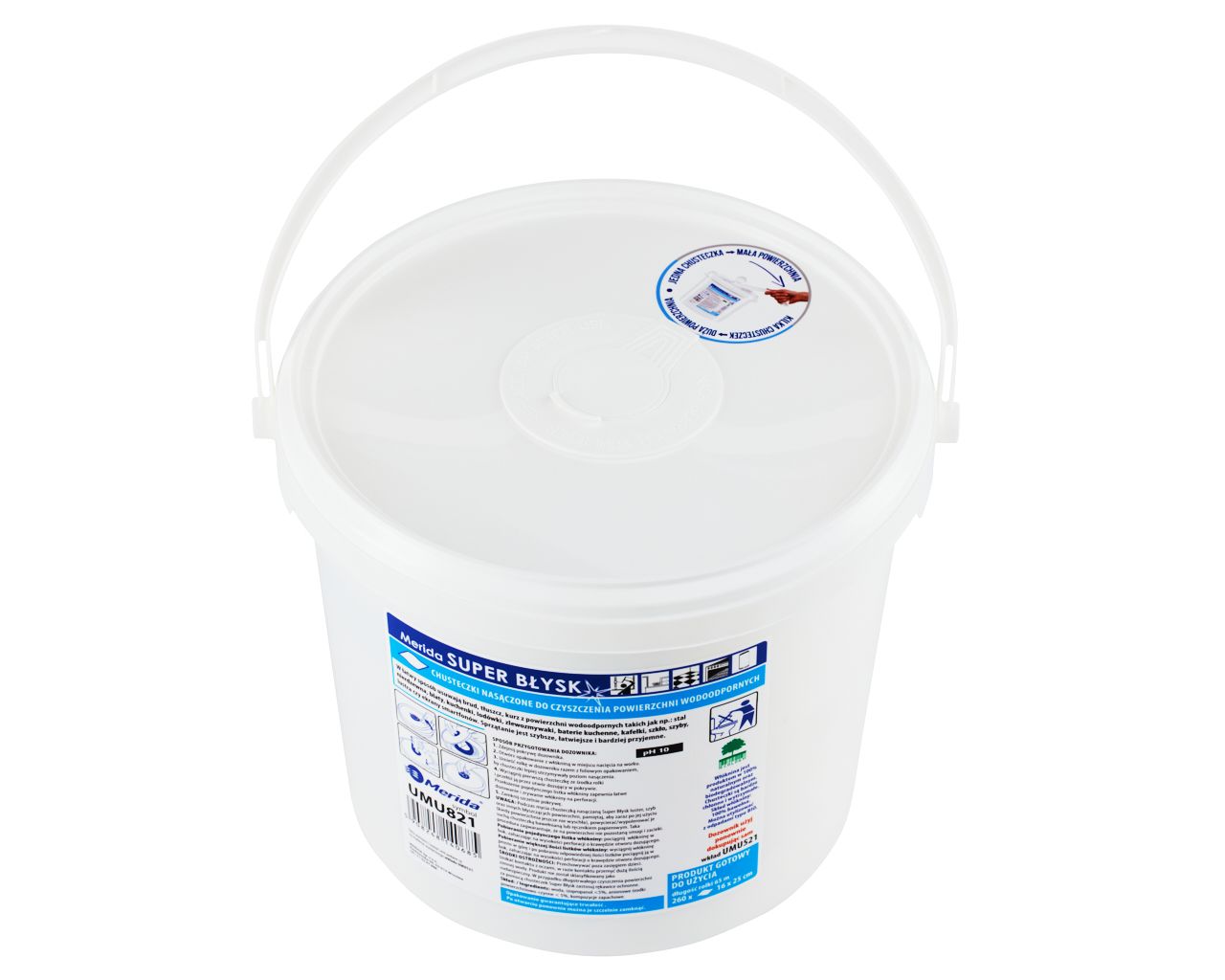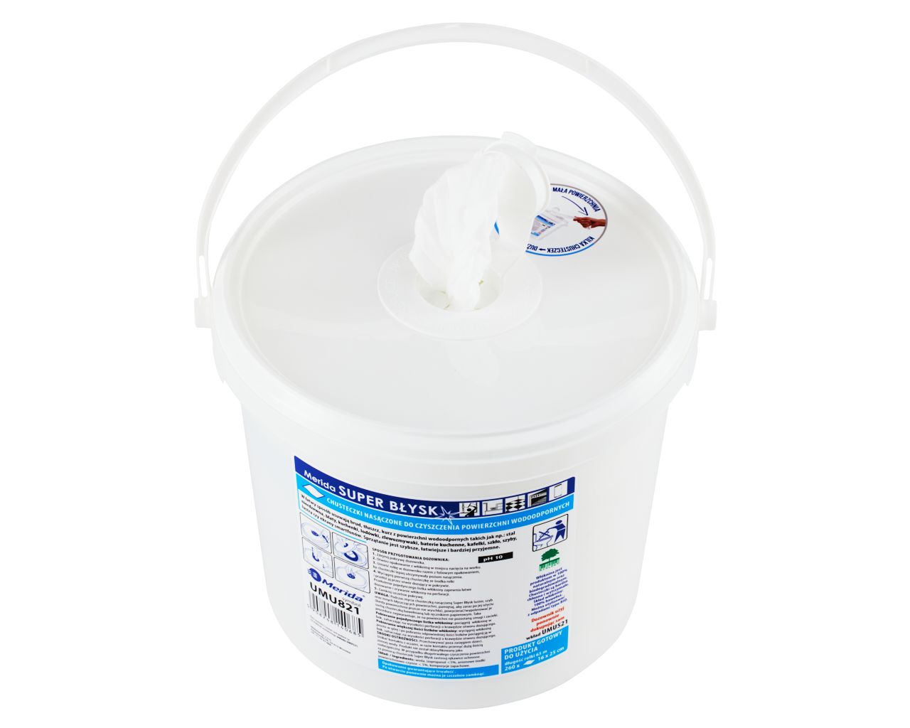 Chusteczki nasączone do czyszczenia powierzchni wodoodpornych MERIDA SUPER BŁYSKwiadro 6 l, rolka 65 m260 listków