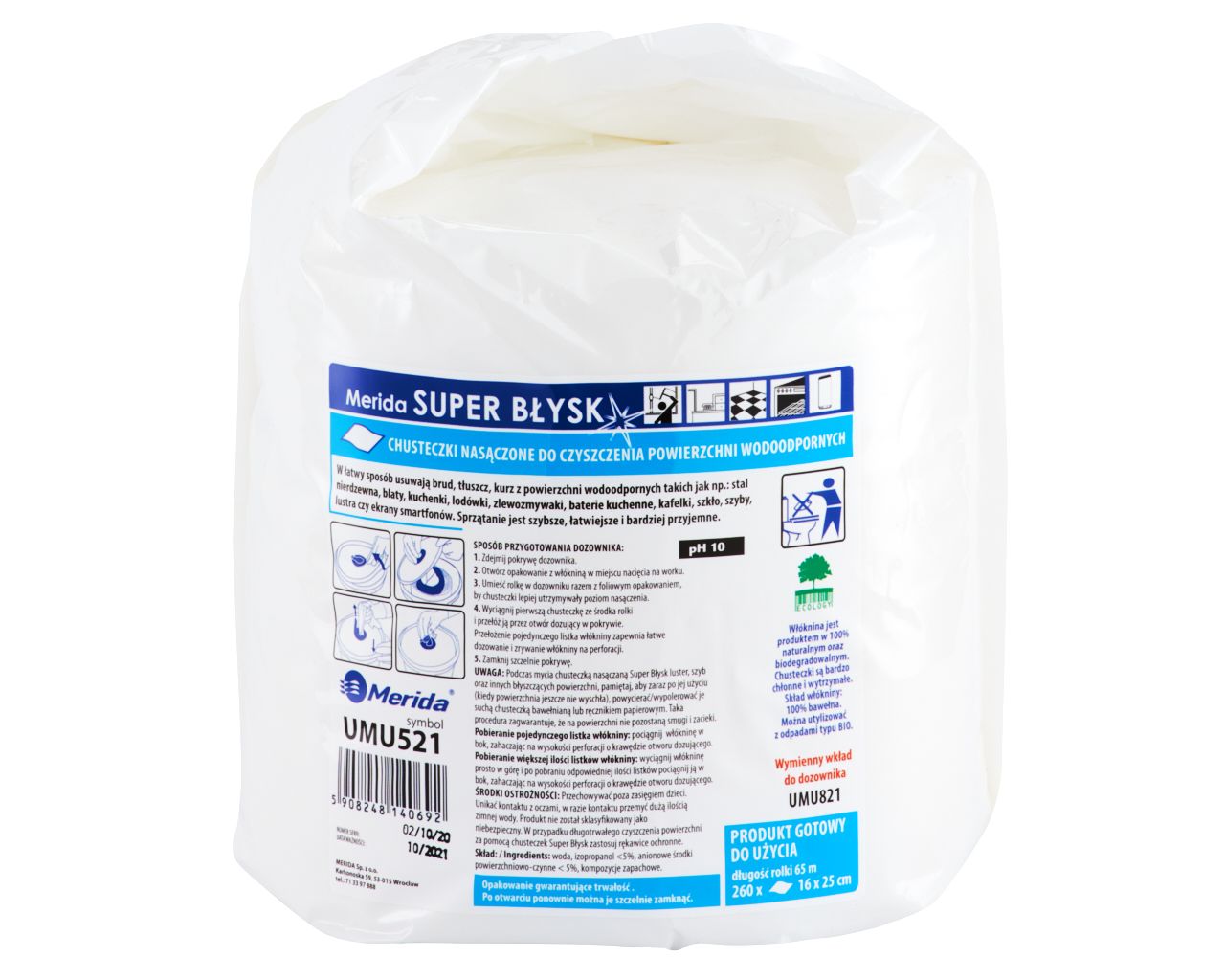 Chusteczki nasączone do czyszczenia powierzchni wodoodpornych MERIDA SUPER BŁYSKwkład uzupełniający do wiadra 6 l, rolka 65 m260 listków
