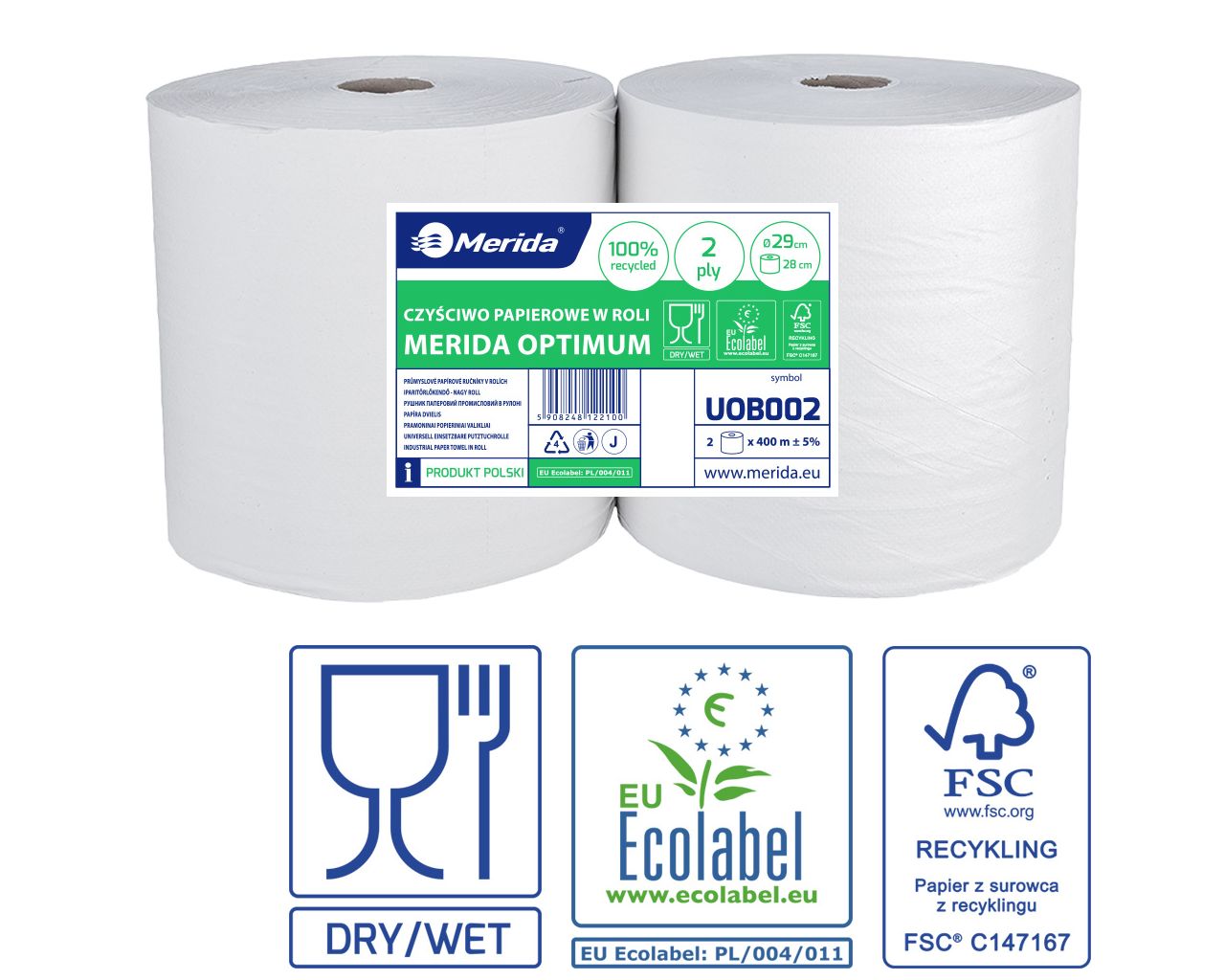 Czyściwo papierowe MERIDA OPTIMUM 29 ECOLABEL (UOB002) to wydajne czyściwo przemysłowe w roli do codziennego utrzymania czystości w firmie: produkcja, warsztat, magazyn, serwis, utrzymanie ruchu oraz obszary wymagające wysokiej higieny (w tym przemysł spożywczy). Jest wykonane z papieru makulaturowego, ma 2 warstwy, jest gofrowane, wodotrwałe i perforowane, dzięki czemu dobrze chłonie i wygodnie się dozuje – bez ciągłego „rwania na oko”. Jedna rolka ma 400 m (aż 1600 listków), a w opakowaniu są 2 rolki.