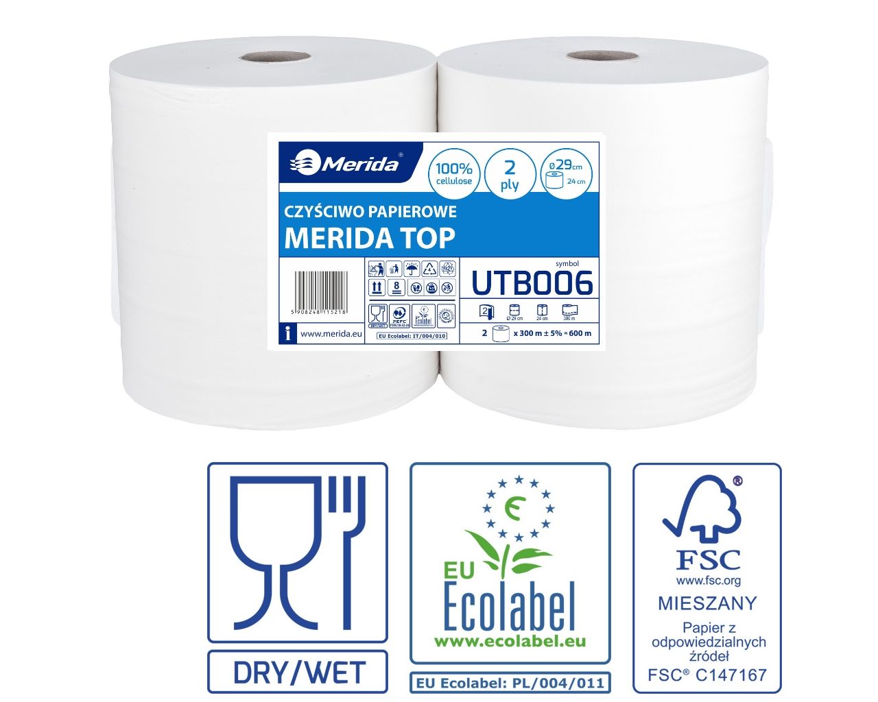 Czyściwo papierowe MERIDA TOP 24 ECOLABEL (UTB006) to profesjonalne czyściwo przemysłowe w roli do szybkiego sprzątania i utrzymania higieny w firmie: produkcja, warsztat, magazyn, serwis, utrzymanie ruchu oraz gastronomia. Wykonane z 100% celulozy, dwuwarstwowe i gofrowane, jest bardzo chłonne i dobrze sprawdza się przy przecieraniu powierzchni, narzędzi oraz zbieraniu płynów. Rolka ma 300 m długości i perforację, więc łatwo dozujesz papier i ograniczasz zużycie. W opakowaniu dostajesz 2 rolki – praktyczny zapas.