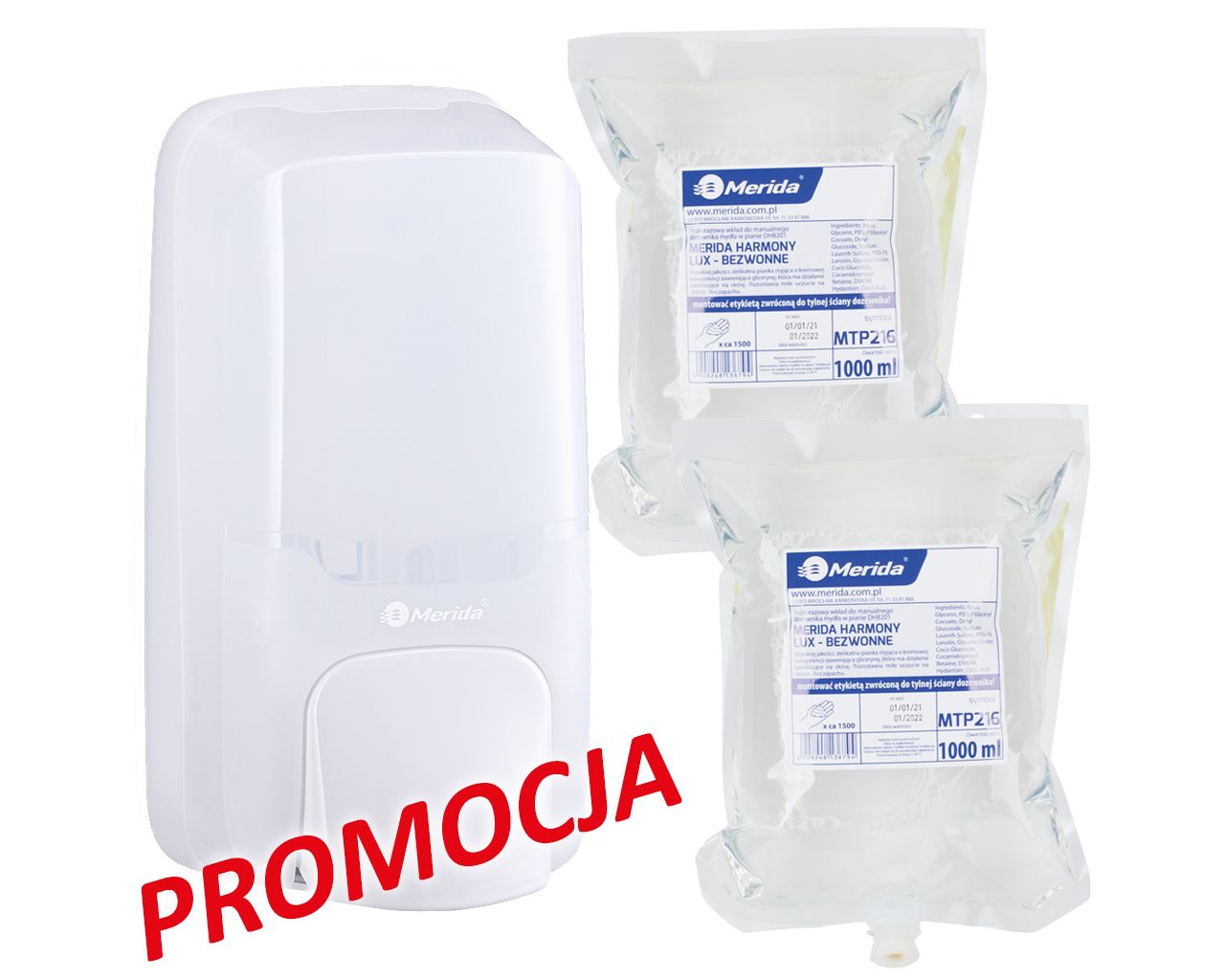 Zestaw Merida Harmony PROMO67 to kompletna propozycja dla tych, którzy cenią elegancję, higienę i oszczędność. Zawiera stylowy, manualny dozownik mydła w pianie (biały-transparentny) oraz dwa bezzapachowe wkłady Harmony Lux o pojemności 1000 ml każdy – wszystko w promocyjnej cenie 75 zł netto.