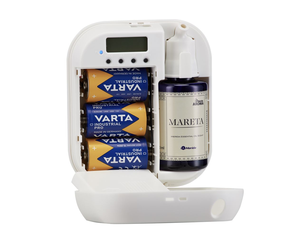 Urządzenie pracuje w pełni automatycznie, a indywidualne ustawienia umożliwiają dopasowanie intensywności zapachu do charakteru wnętrza. Zasilanie może odbywać się przez USB (5 V / 1 A) lub za pomocą trzech baterii typu R20 (D), co daje elastyczność w miejscach bez gniazdka. Wskaźnik stanu baterii informuje o konieczności wymiany, a urządzenie można zamontować na ścianie lub ustawić jako wolnostojące — według potrzeb i aranżacji przestrzeni.