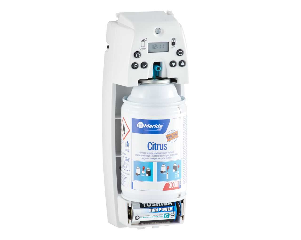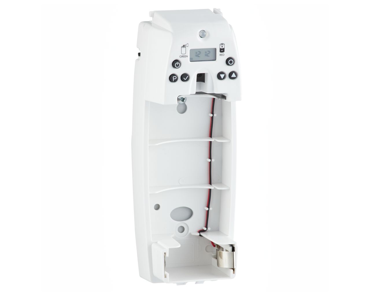 – elektroniczny programator pozwala na ustawienie następujących parametrów: aktualna godzina i dzień tygodnia, godzina rozpoczęcia pracy urządzenia, godzina zakończenia pracy urządzenia, czas odstępu między dozowaniem zapachu (od 1 do 60 min.), dni w których urządzenie nie pracuje; po zakończeniu programowania odświeżacza wyświetlana jest informacja, na ile dni pracy wystarczy jeden wkład zapachowy