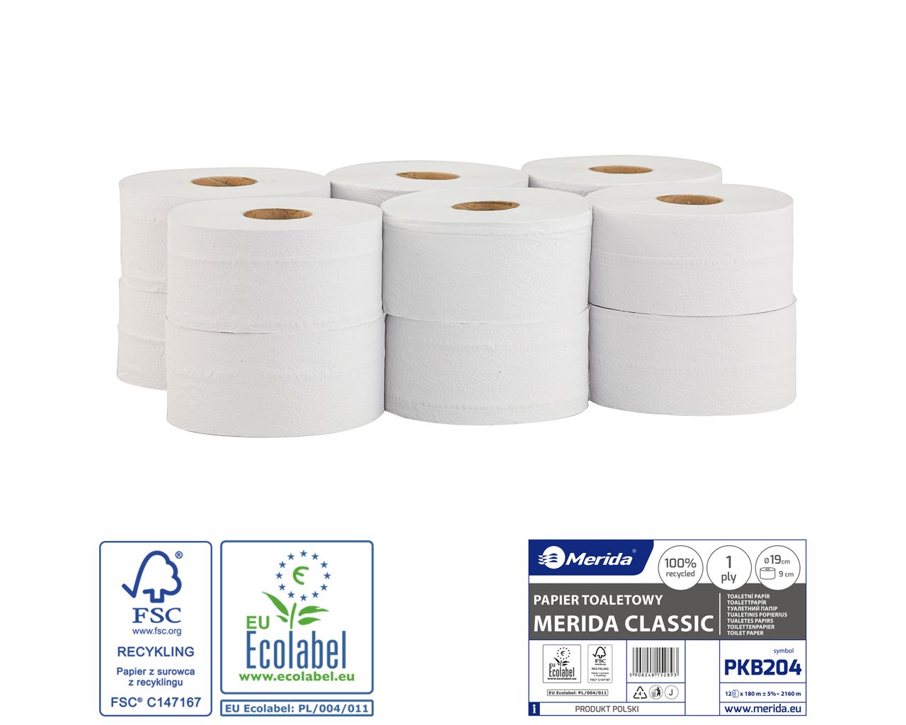 Papier toaletowyMERIDA CLASSIC ECOLABEL, jednowarstwowy, biały, średnica 19 cm, długość 180 mzgrzewka 12 szt.