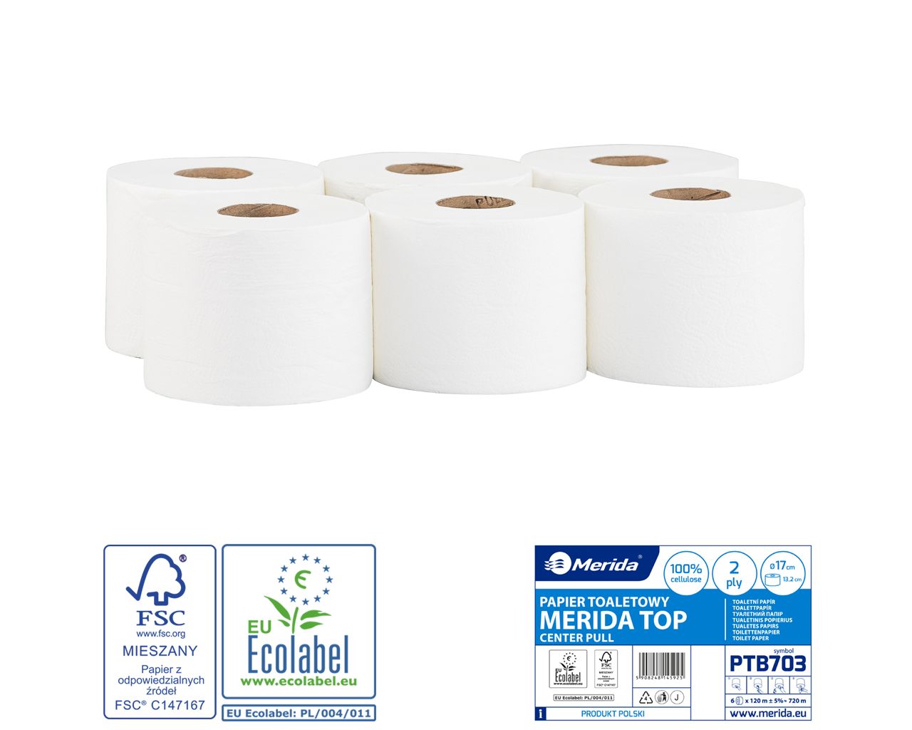 Papier toaletowy MERIDA TOP CENTER PULLbiały, średnica 17 cm, długość 120 m, dwuwarstwowy, zgrzewka 6 szt.ECOLABEL