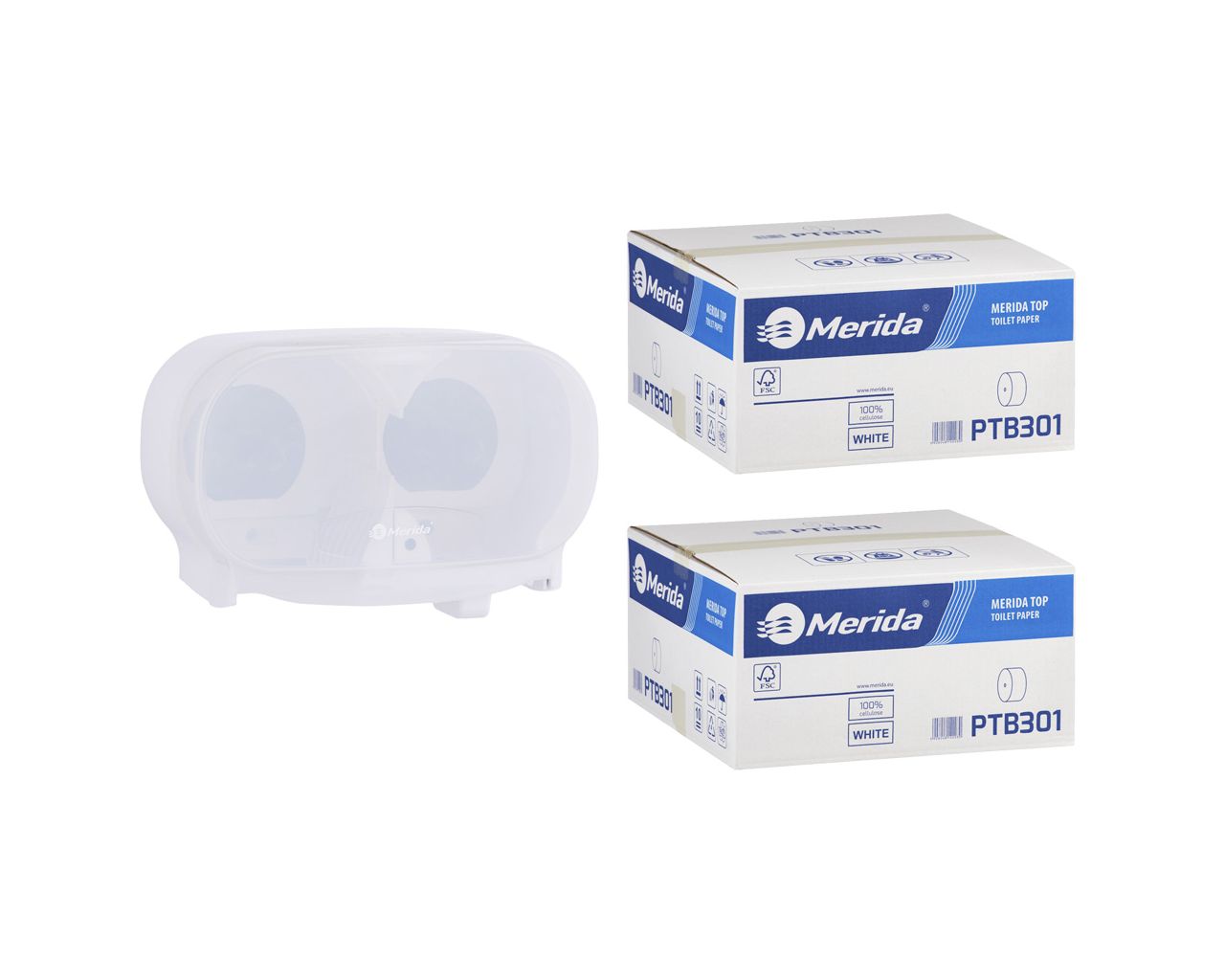 Pojemnik na dwie rolki papieru toaletowego bez gilzy MERIDA HARMONY za 50 zł netto przy zakupie 2 kartonów papieru toaletowego MERIDA TOP PTB301 (36 x 85 m = 3060 m12 240 listków)