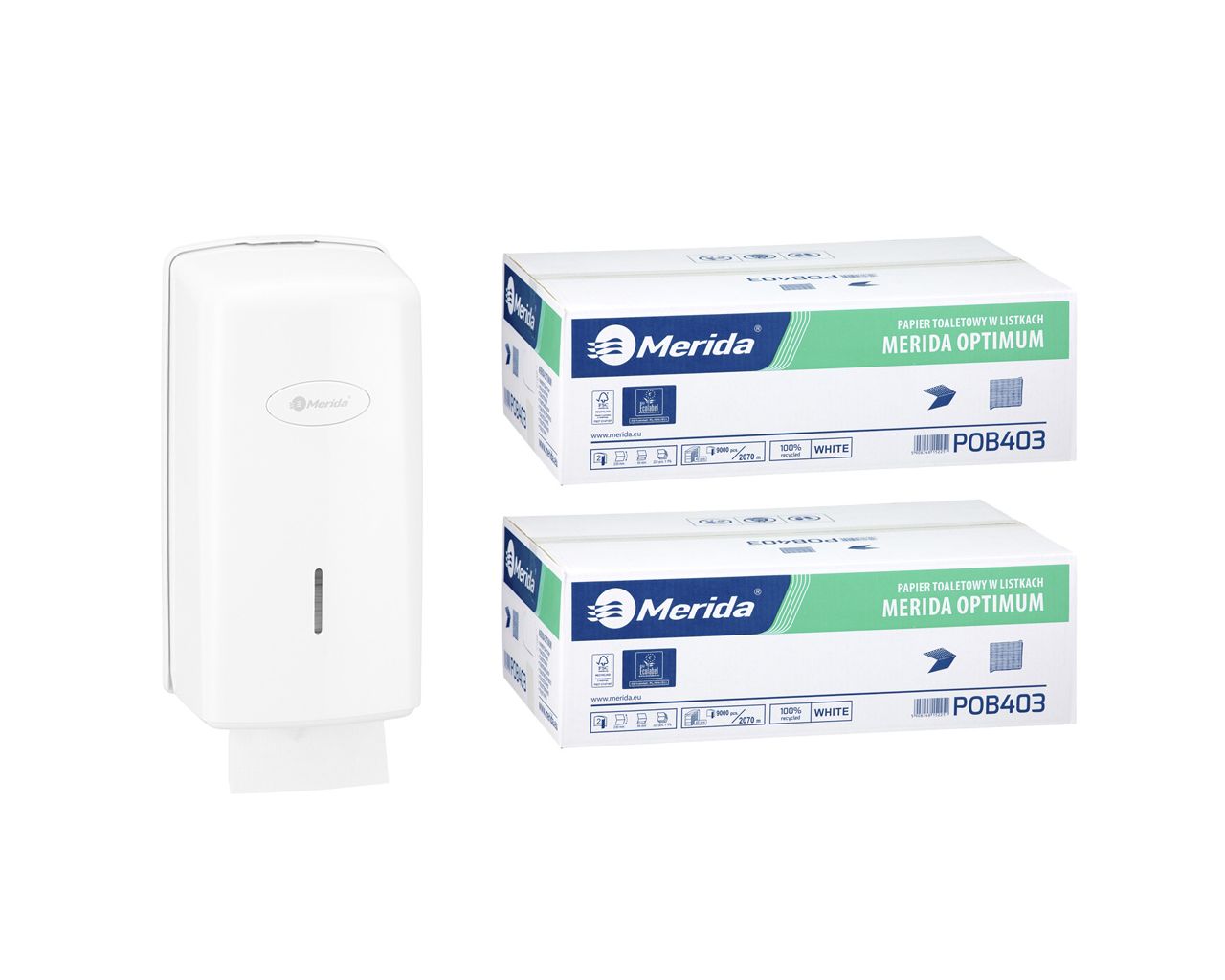 Papier toaletowy w listkach, MERIDA OPTIMUM ECOLABEL, dwuwarstwowy, biały, karton 9000 szt.