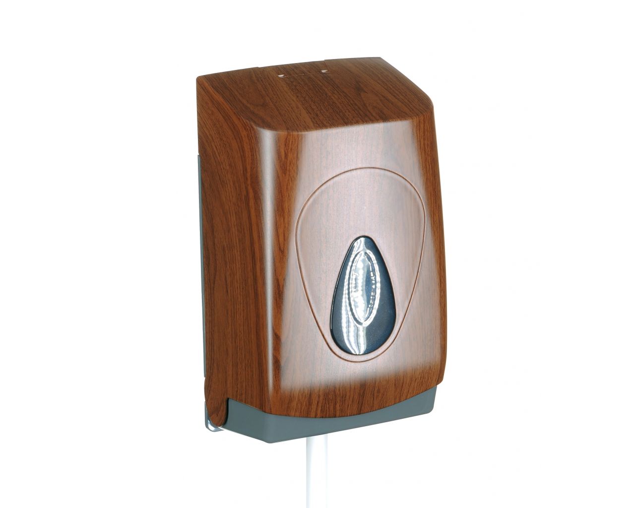 Pojemnik wykonany z wysokiej jakości tworzywa ABS o pojemność do 400 szt. listków papieru. Dostosowany do użytkowania z papierem toaletowym w listkach. Zaopatrzony w ozdobne, ciemnoszare okienko umożliwiające kontrolę ilości papieru w pojemniku. Odporny na działanie UV. Pojemnik zamykany na kluczyk.