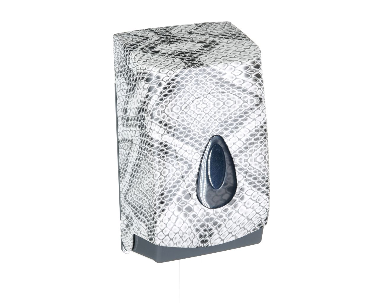 Pojemnik wykonany z wysokiej jakości tworzywa ABS o pojemność do 400 szt. listków papieru. Dostosowany do użytkowania z papierem toaletowym w listkach. Zaopatrzony w ozdobne, ciemnoszare okienko umożliwiające kontrolę ilości papieru w pojemniku. Odporny na działanie UV. Pojemnik zamykany na kluczyk.
