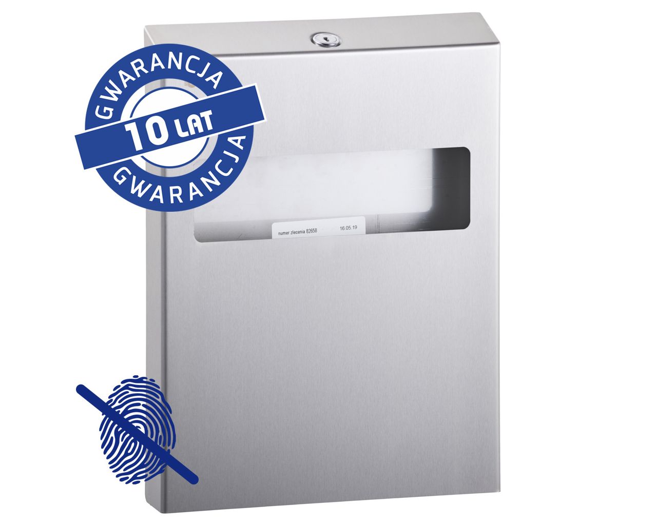 Pojemnik na podkładki na deskę sedesową mieści wymienne wkłady zawierają 100 szt. papierowych podkładek higienicznych. Łączenia boków obudowy spawane i szlifowane. Urządzenie posiada niewidoczne zawiasy. Pojemnik na podkładki na deskę sedesową zabezpieczony trwałym stalowym zamkiem bębenkowym, zamek zlicowany z powierzchnią urządzenia. Urządzenie wykonane w całości ze stali nierdzewnej matowej.