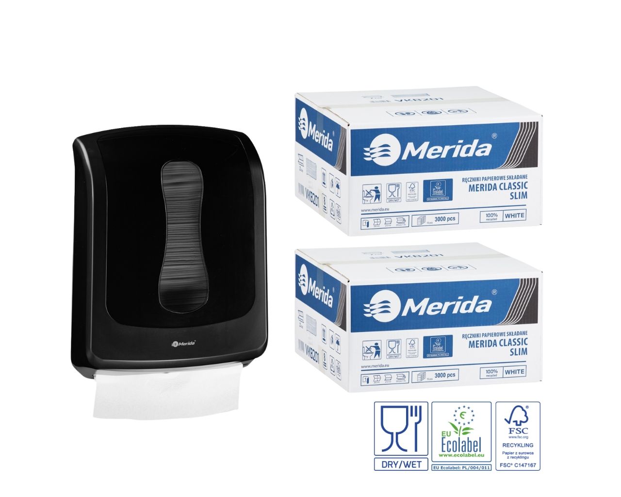 Zestaw promocyjny: czarny pojemnik Merida ONE SLIM + 2 kartony ręczników Classic SLIM Ecolabel