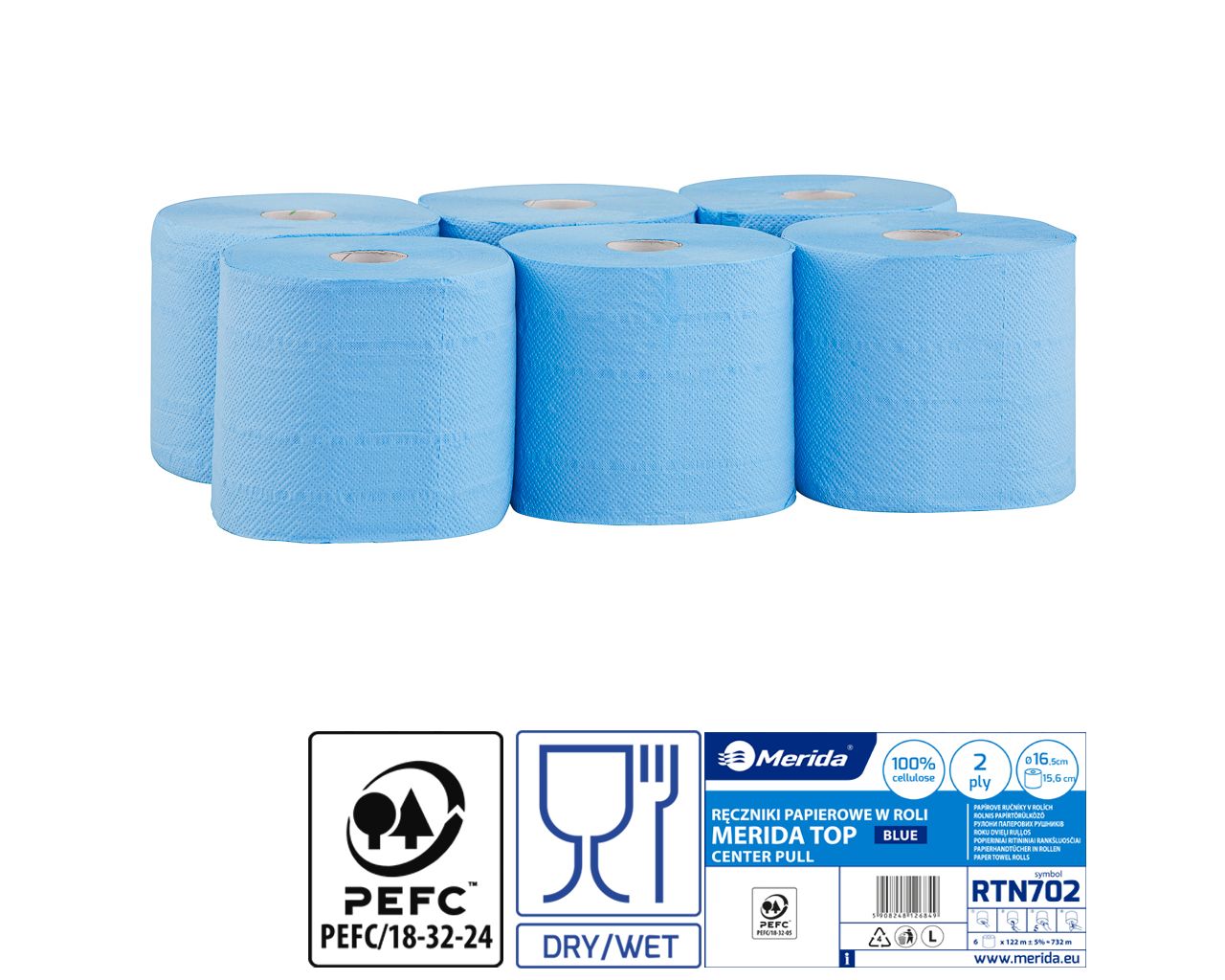 Ręczniki papierowe w roliMERIDA TOP CENTER PULL MINI, dwuwarstwowe, niebieskie, średnica 16,5 cm, długość 122 mzgrzewka 6 rolek