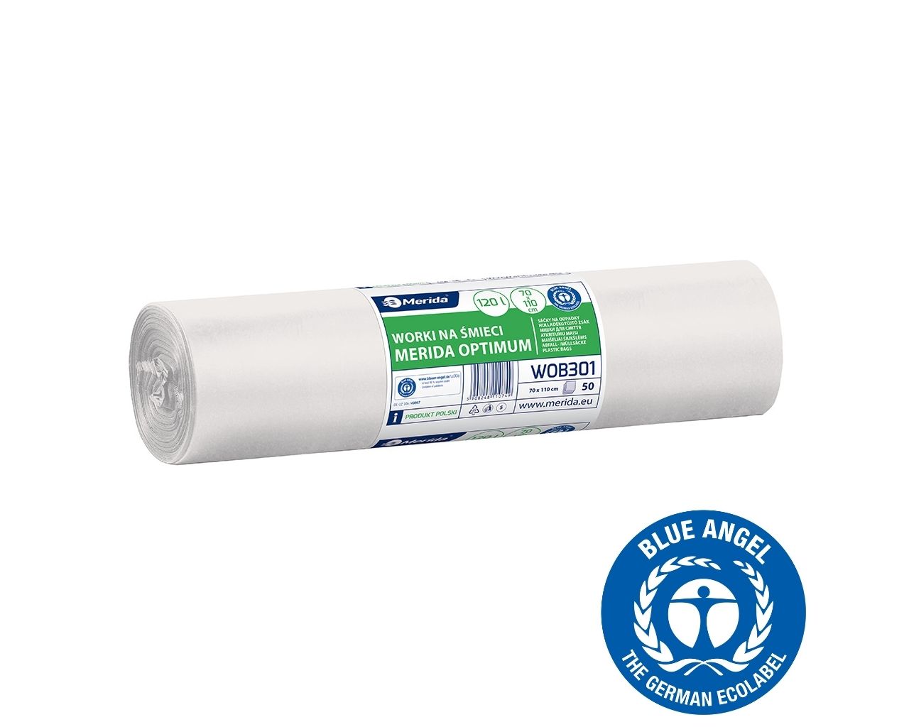 Worki na śmieci 120 lMERIDA OPTIMUM BLUE ANGEL, białe, 70×110 cmrolka 50 szt.