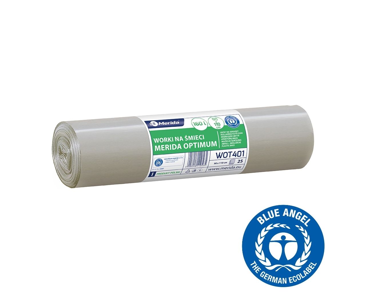 Worki na śmieci 160 lMERIDA OPTIMUM BLUE ANGEL, bezbarwne, 90×110 cmrolka 25 szt.