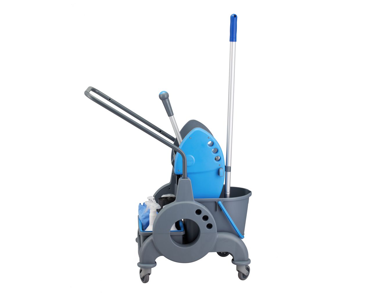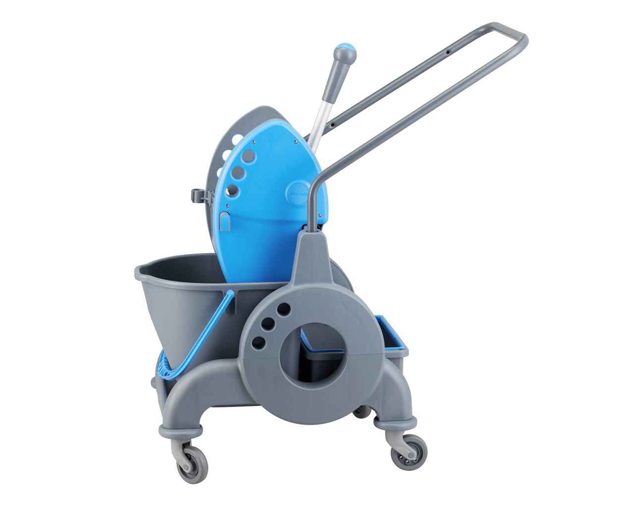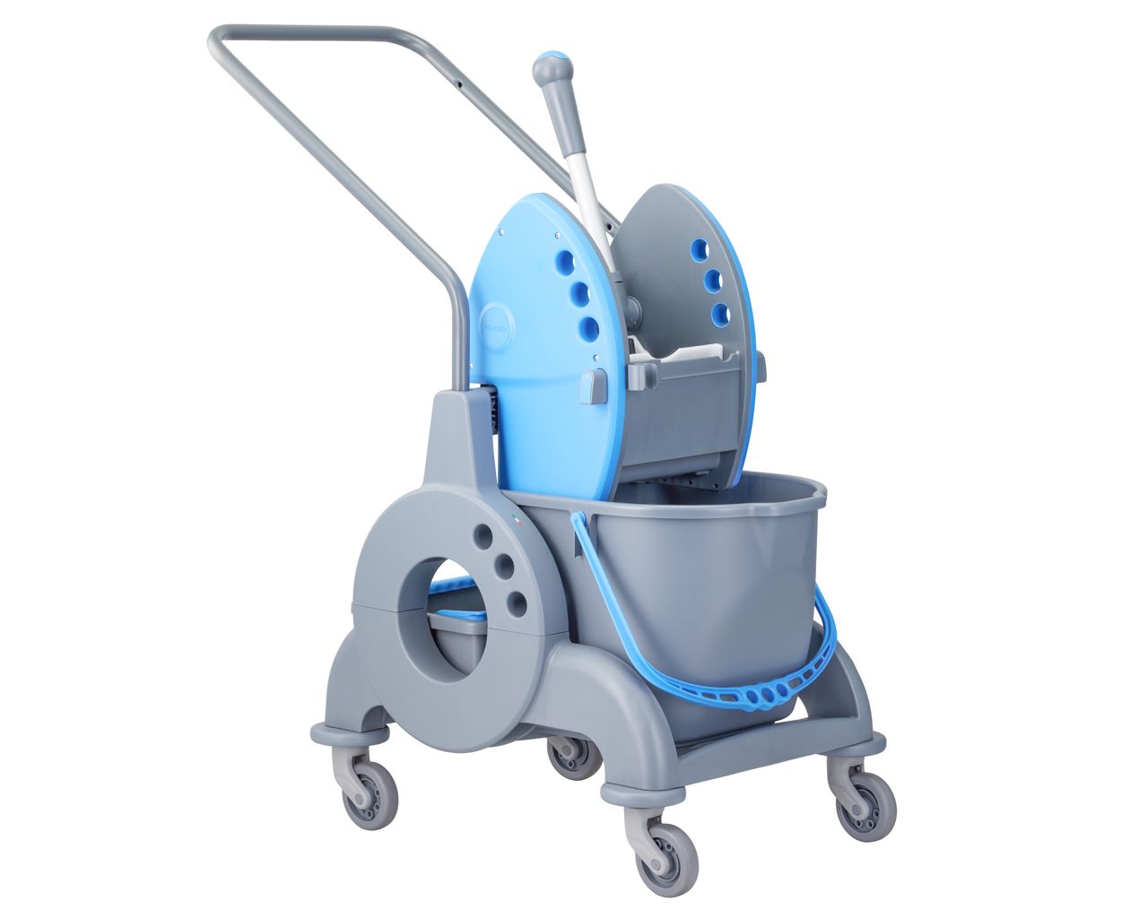 – wyposażony w wiadro o pojemności 15 litrów i kuwetę o pojemności 8 litrów (możliwa jest praca w systemie wózka dwuwiadrowego)