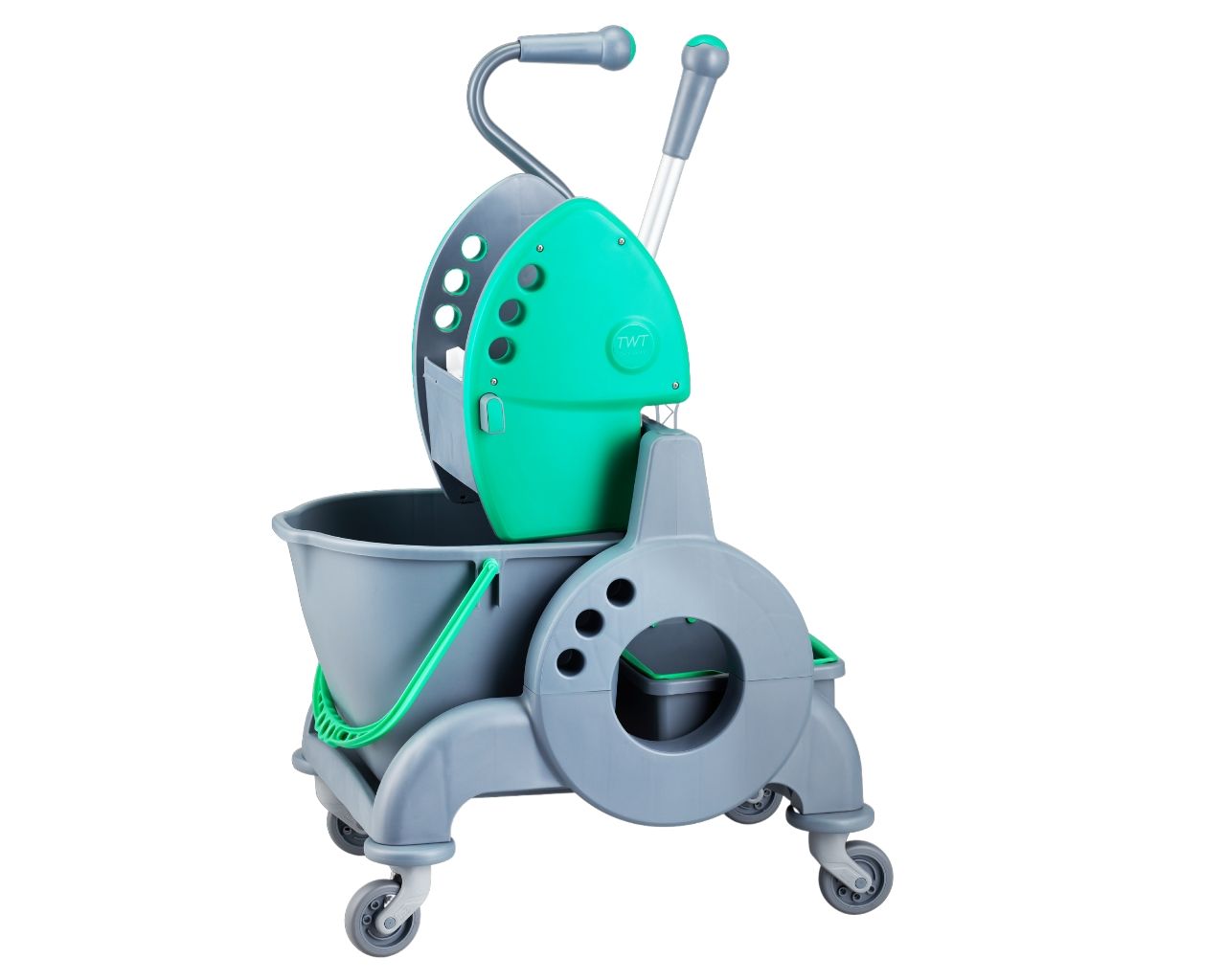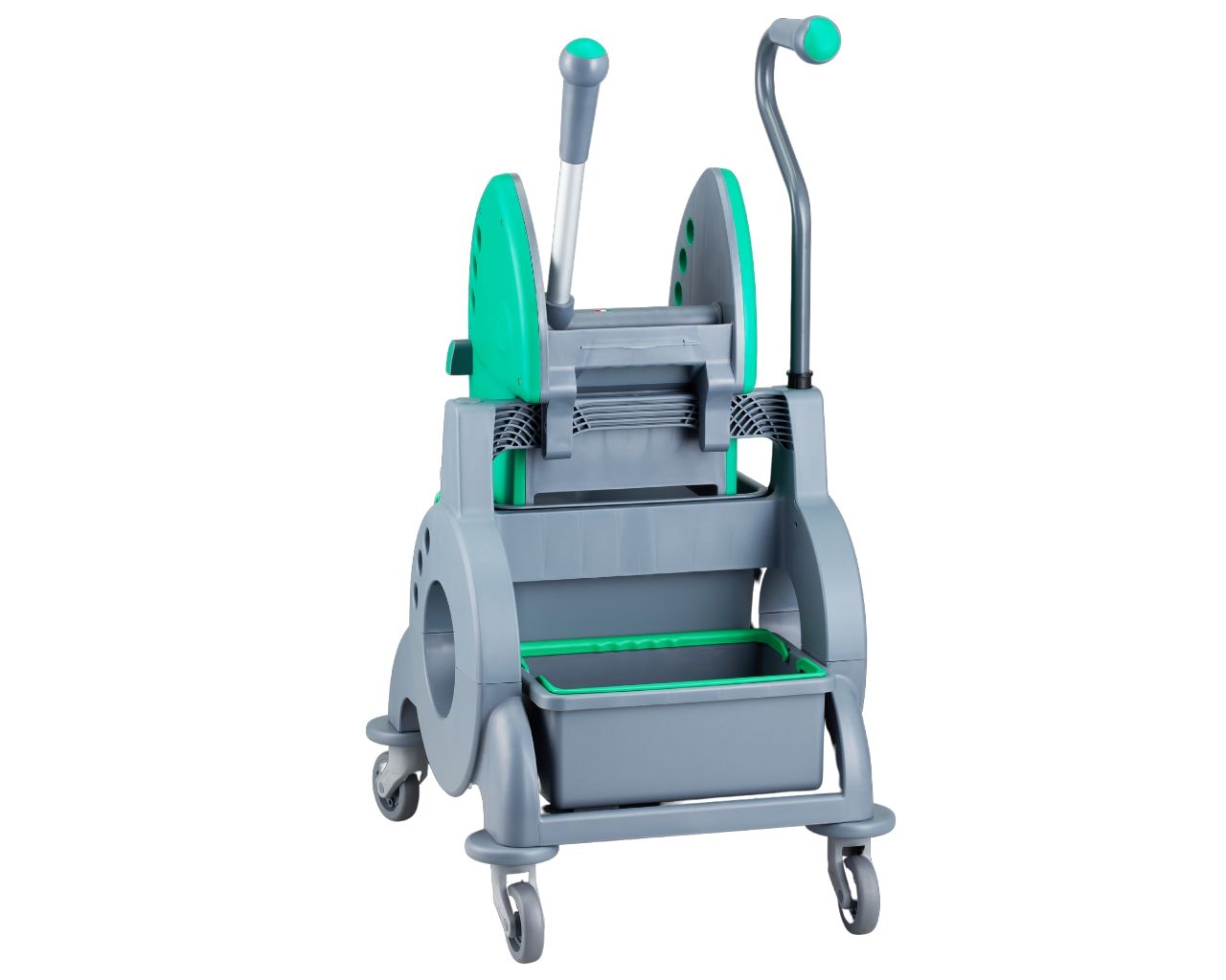 Wózek serwisowy do sprzątaniajednowiadrowy, wiadro 15 l, kuweta 8 l, prosta rączkazielona prasa